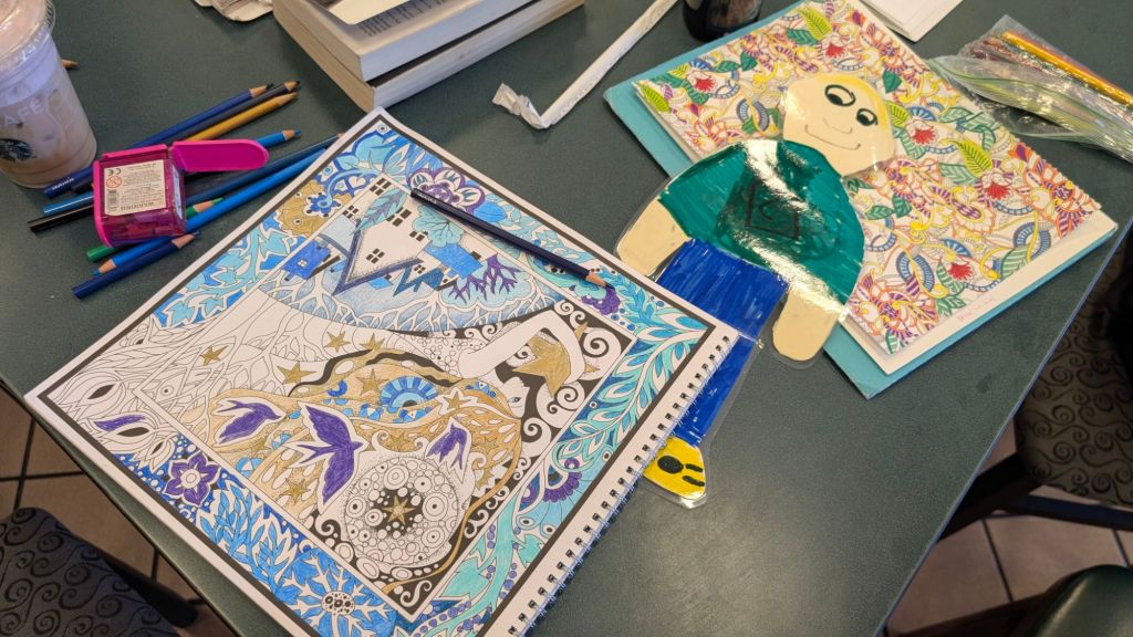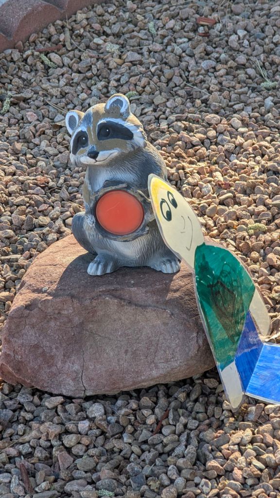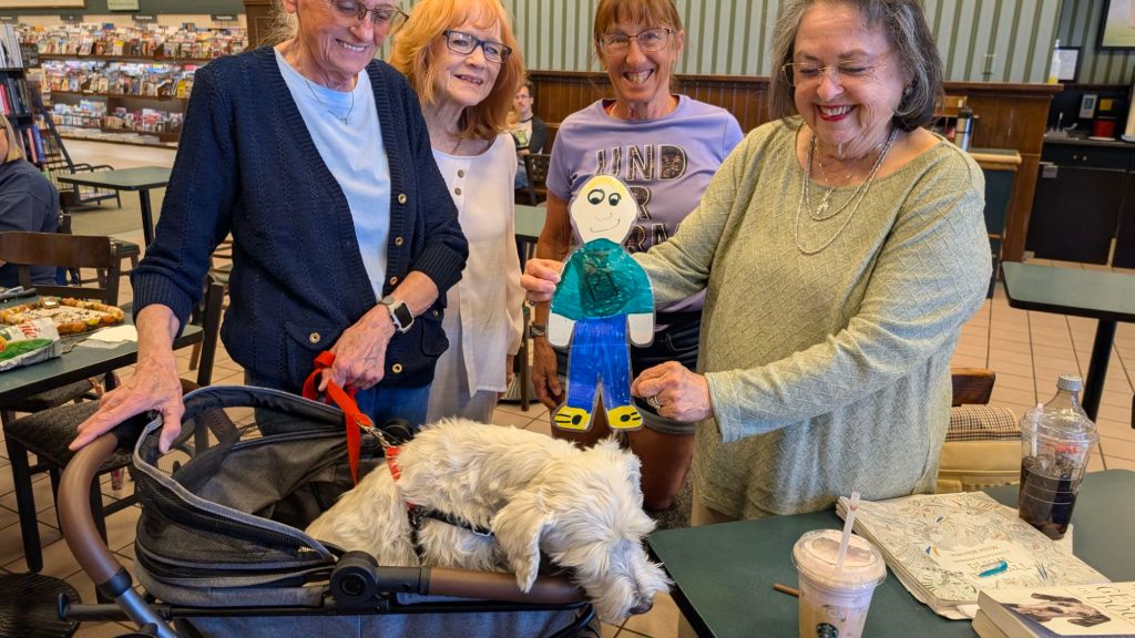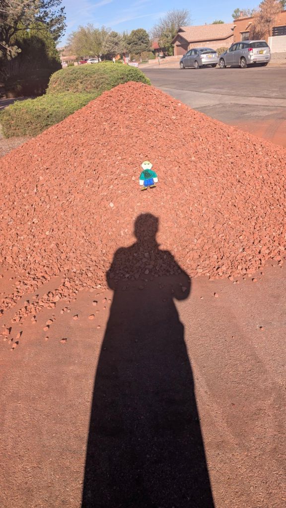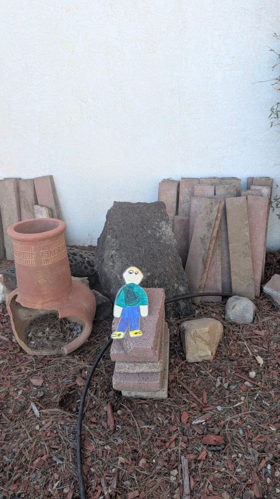 Stanley went climbing on the very tall mountain of rock we have in front of our house.Stanley is checking out the bricks and a chimenia (outdoor fireplace) that are waiting to be placed on our yard.Stanley made friends with a racoon.Stanley met Fritzi, a friend’s dog who has to use a stroller.Stanley is picking out colored pencils to color with. Stanley wishes Malachy was here too. He’s having lots of fun.