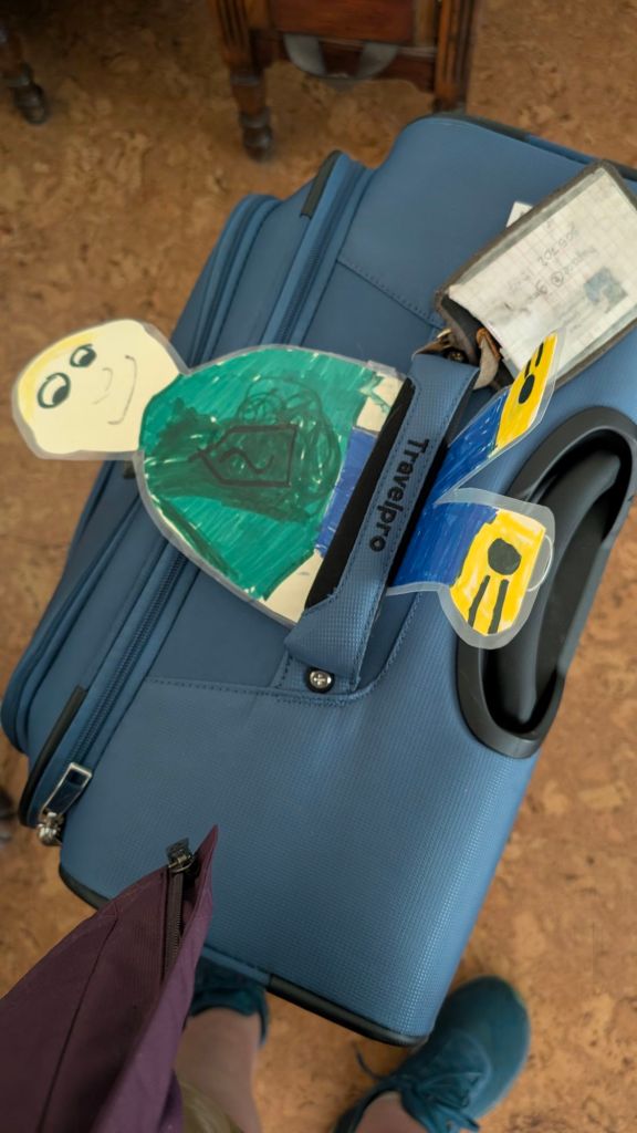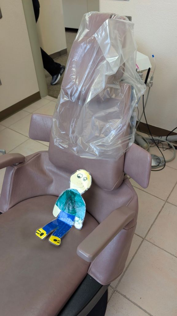 Stanley went with Baba B to the dentist to get ready for their big trip.Stanley sat in the dentist’s chair and let the dentist look at his teeth. “Outstanding!”, he said”you must be brushing after every meal.”Then Stanley helped Baba b pack and tried out the different options for him to travel to the airport. There was the big suitcaseThe little backpackAnd finally, Baba B s travel vest. That was the cosiest, so that’s what he picked
