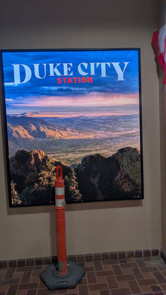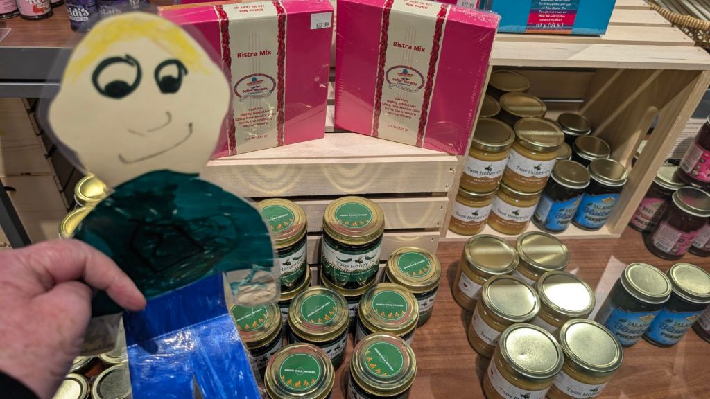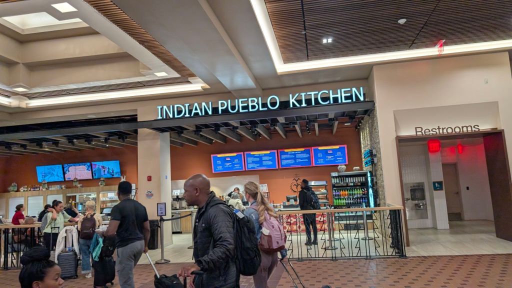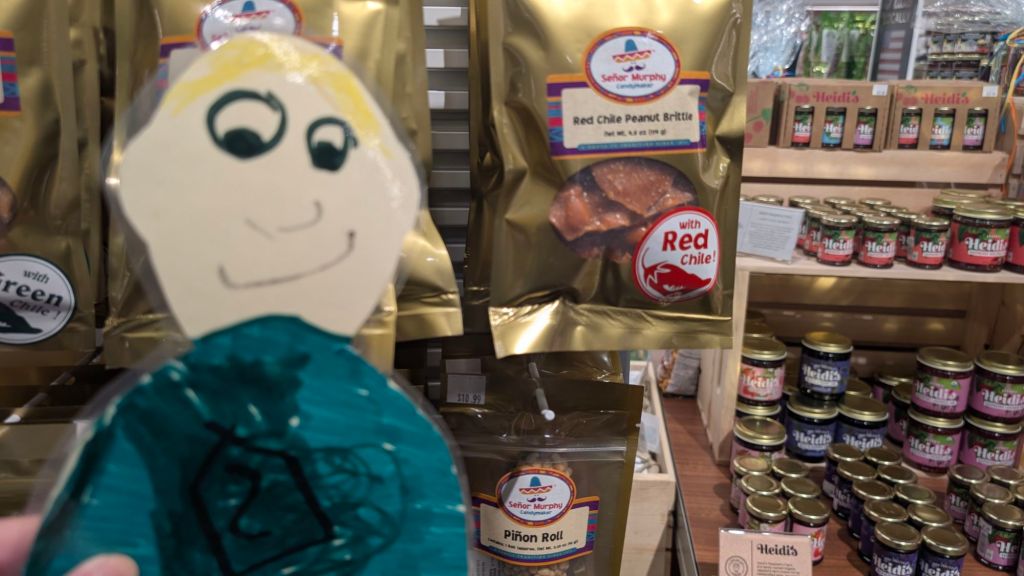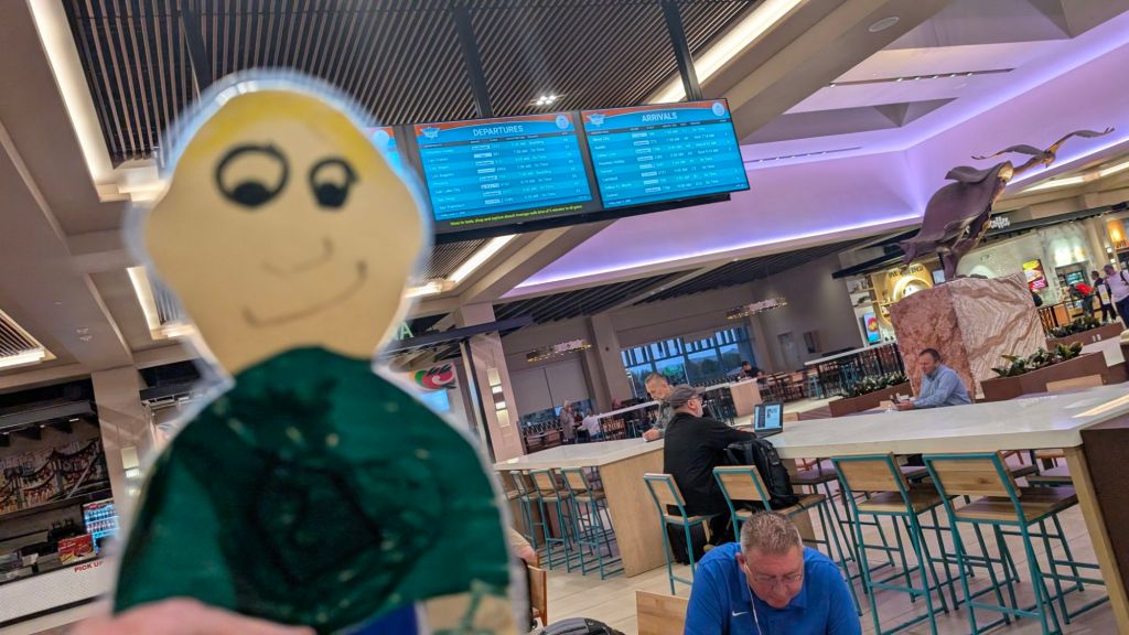 We got up super early to catch our flight so Stanley was eager to try out one of the new restaurants in the food court. He got a breakfast burrito (eggs, chili, cheese) at the pueblo kitchenThis shop has lots of vegetarian and vegan options. Baba B got a chai. YummyStanley thought the chili infused homies sounded yummyHe also wanted to try red chili pralines!Stanley is checking the blue arrivals and departures board to make sure our plane is still on time. So far, we are set. Baba B requested a digital key for our hotel. Stanley won’t need a key, he’ll just slide under the door. Clever Stanley Albuquerque is also called duke city. So Stanley is saying goodbye to New Mexico and hello to Texas today