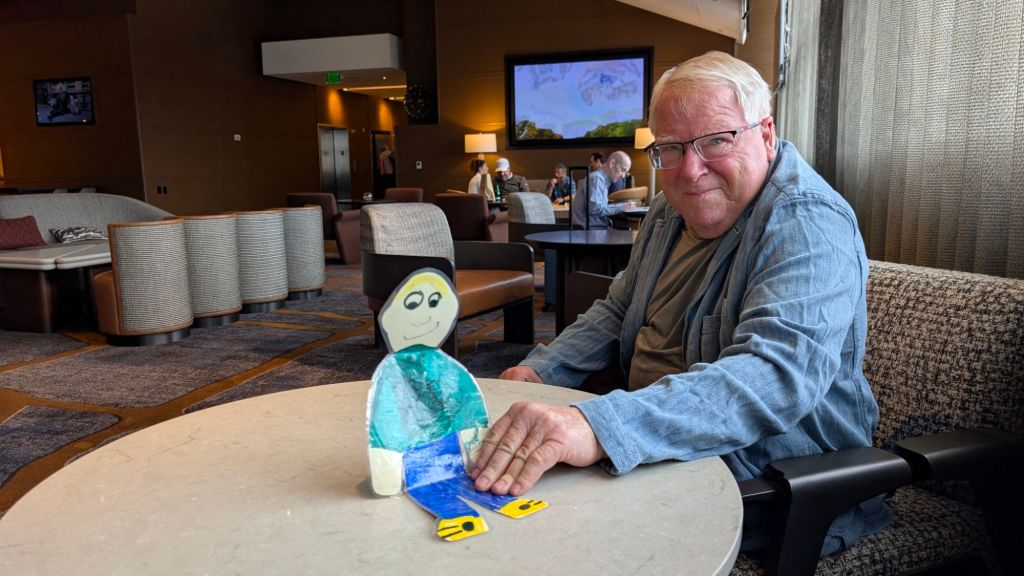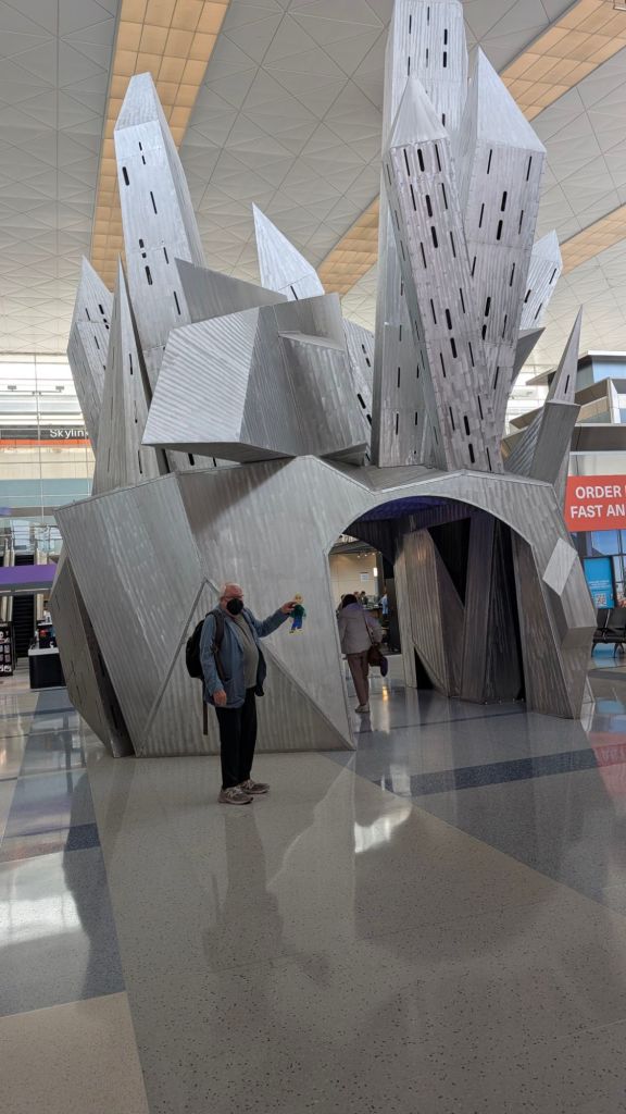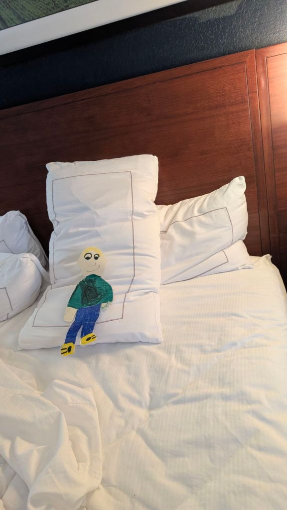 Stanley thought this castle at the Dallas airport was the coolest.Waiting for our digital key to activate, we had a nice lunch. Stanley had toffee pudding.Stanley took over the whole king sized bed. He takes up more space on the bed than even Luca does.Meanwhile, Luca is having fun in Albuquerque