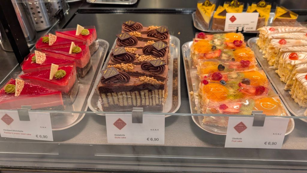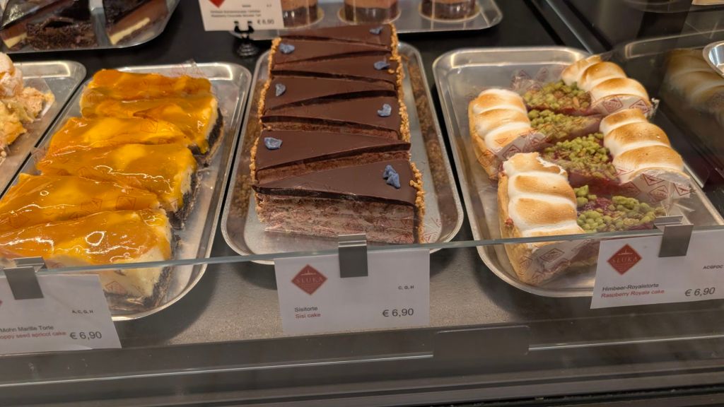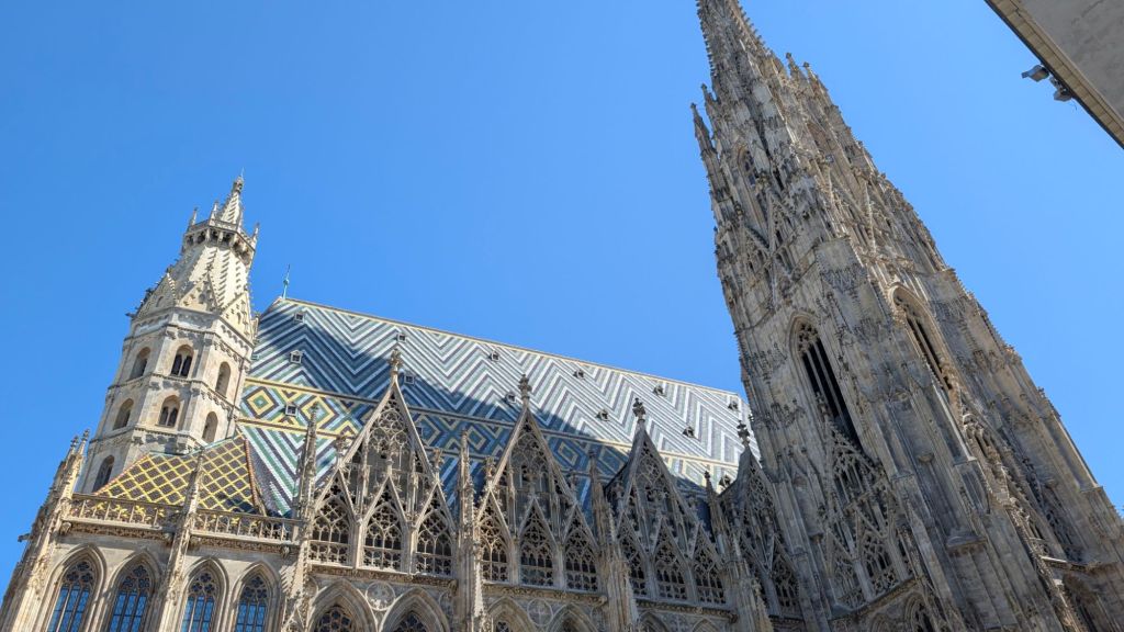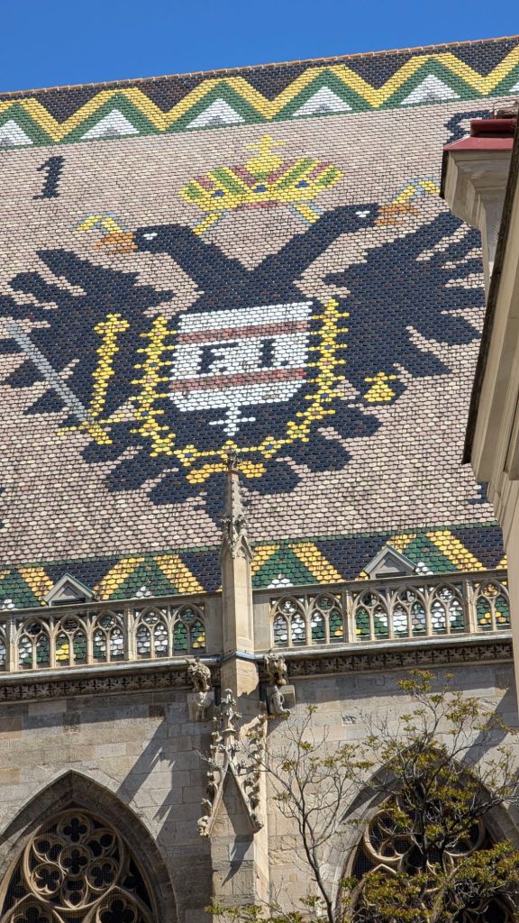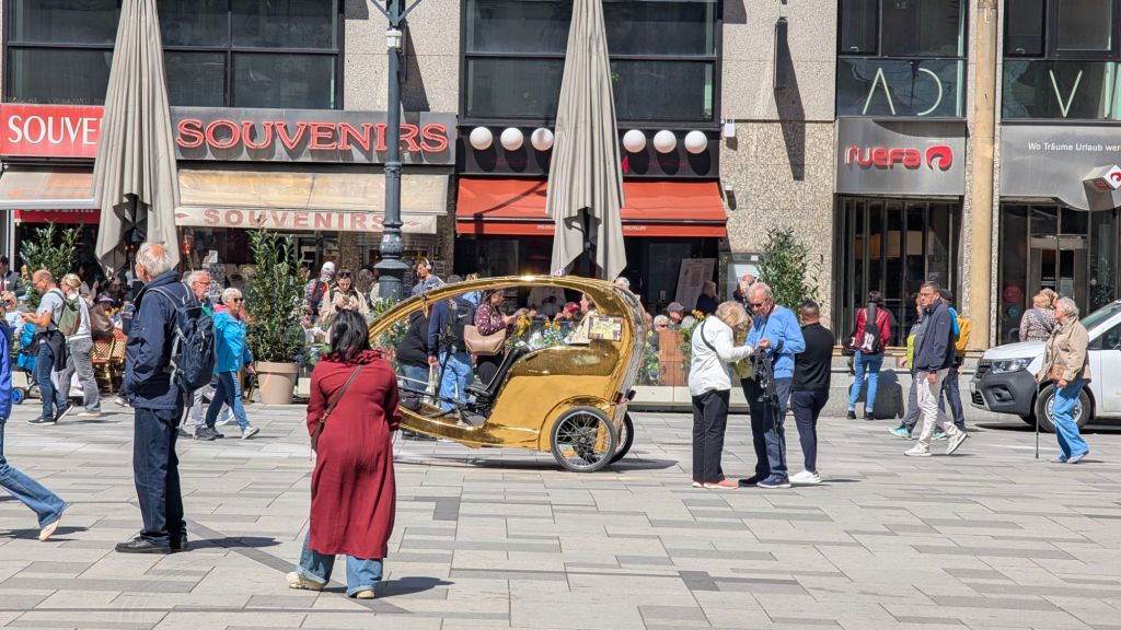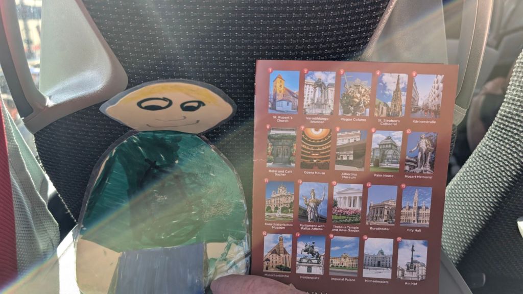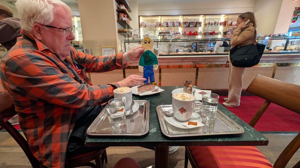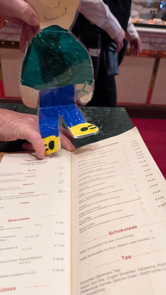 Stanley checking out the menu for hot chocolate, coffee and pastry at a traditional coffeehouse in beautiful Vienna, Austria Stanley feels it’s difficult to choose between all the delicious options. Which would you choose?More optionsStanley helping Baba B and Grandpa Ray with their hot chocolates and cakes He feels that it was all very tastyThe shop had samples of marzipan Disney figures that they use to decorate cakexTigger was Stanley’s favoriteThis is a “gold plated” pedi-cab. It is powered by a bicyclist in the front.This is the cathedral with a newer roof to replace that destroyed in WWII Another portion of the new roof on the cathedral. Stanley thought this was extra cool.Stanley with the guide yourself tour app card for Vienna. He saw everything so now he’s tired and is going to take a nap.