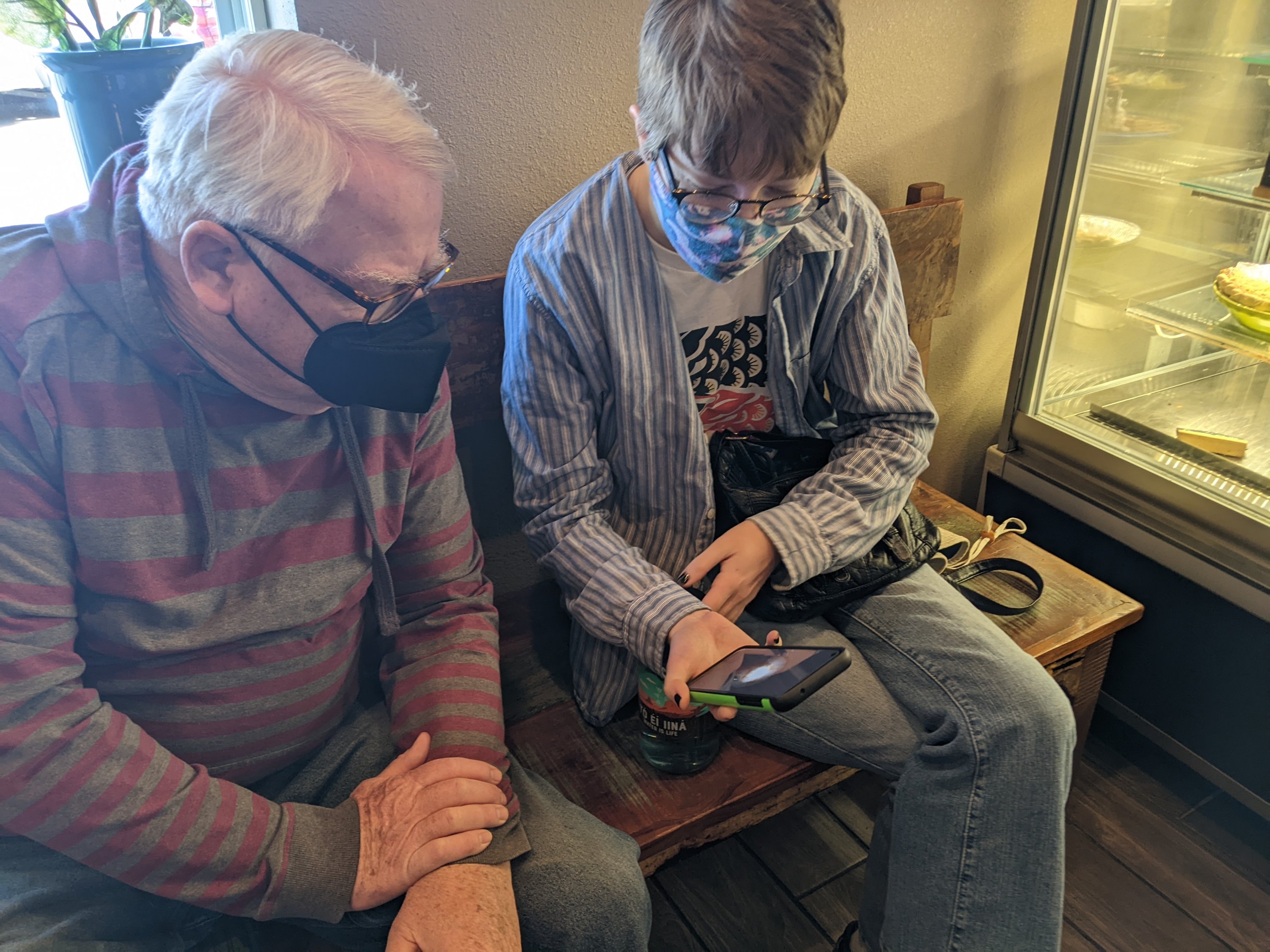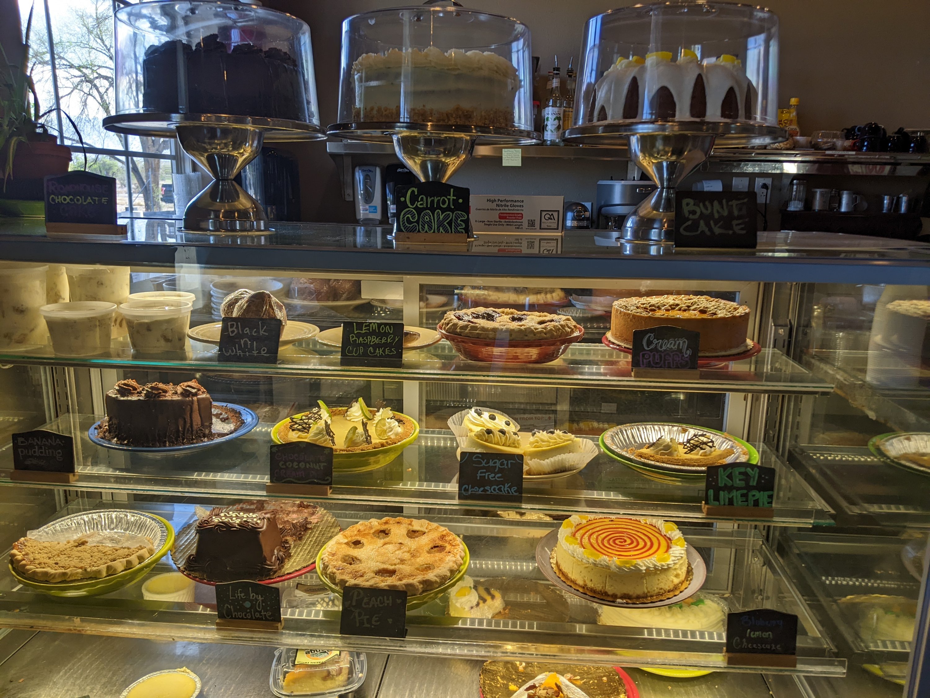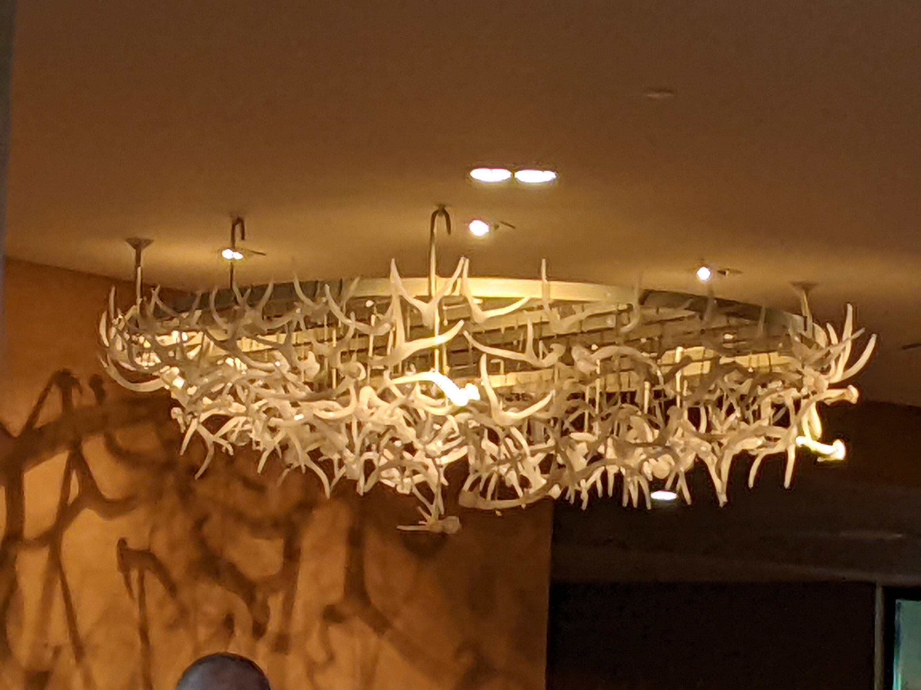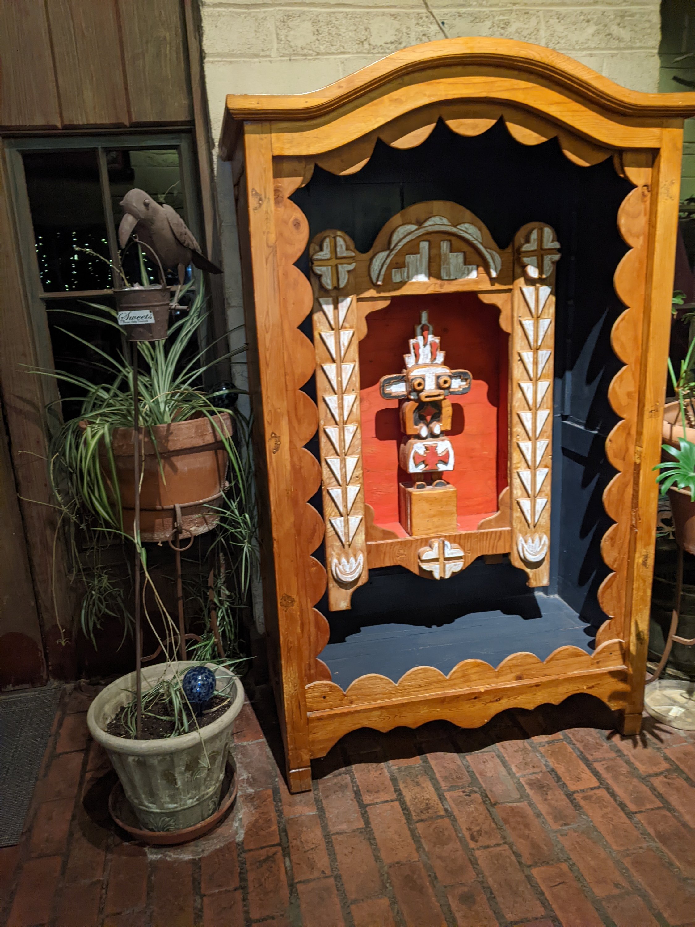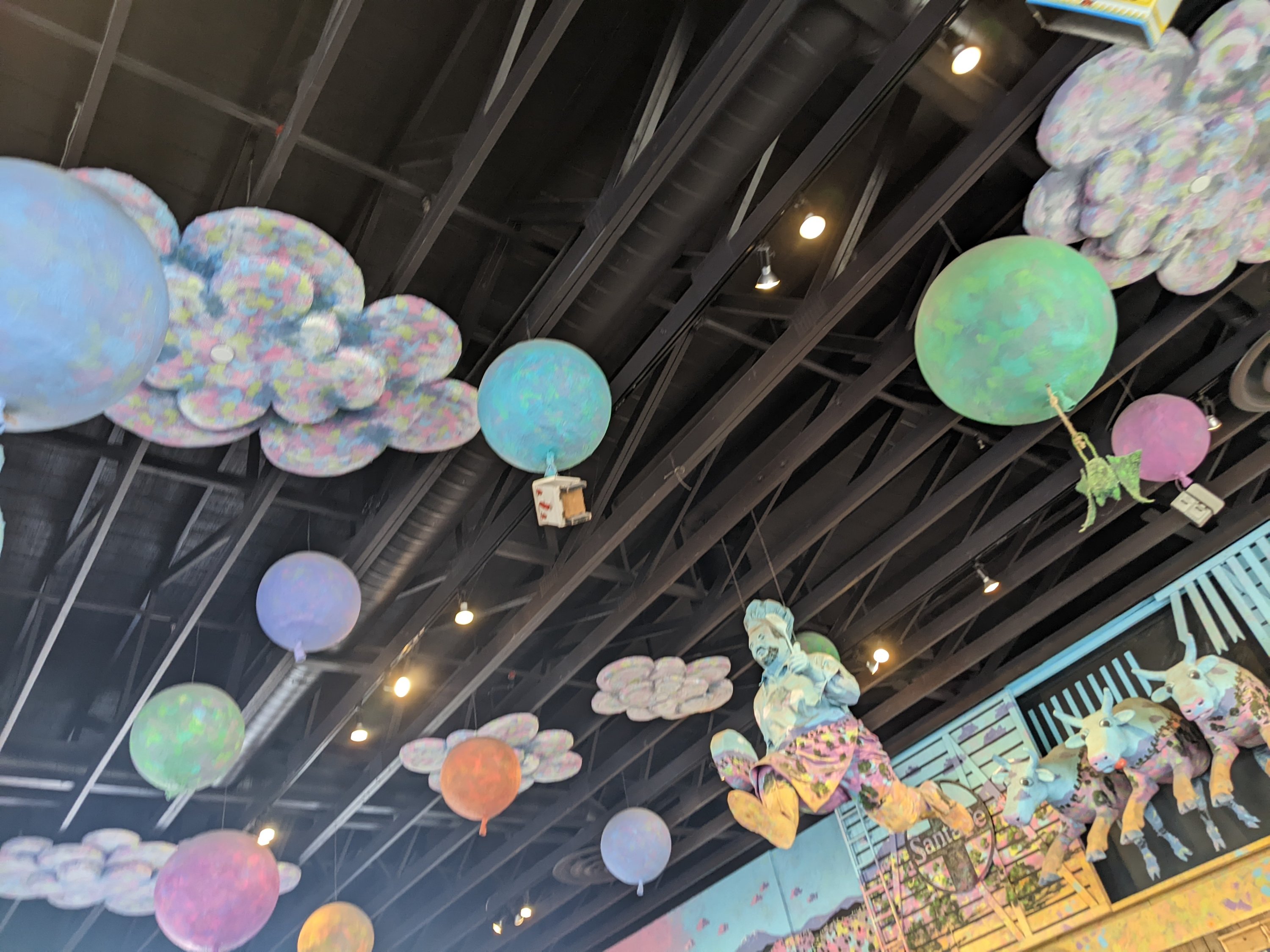 One of the chainsaw sculptures in the bosque.The rio grande, unsually highPinon pancakes at the Range cafe were a hitLots of fun art on the Range cafe ceilingRay and Ayley discussing serious thingsA tempting case of delightsMore fun artWe enjoyed some beers at the native owned Bow and Arrow brewery