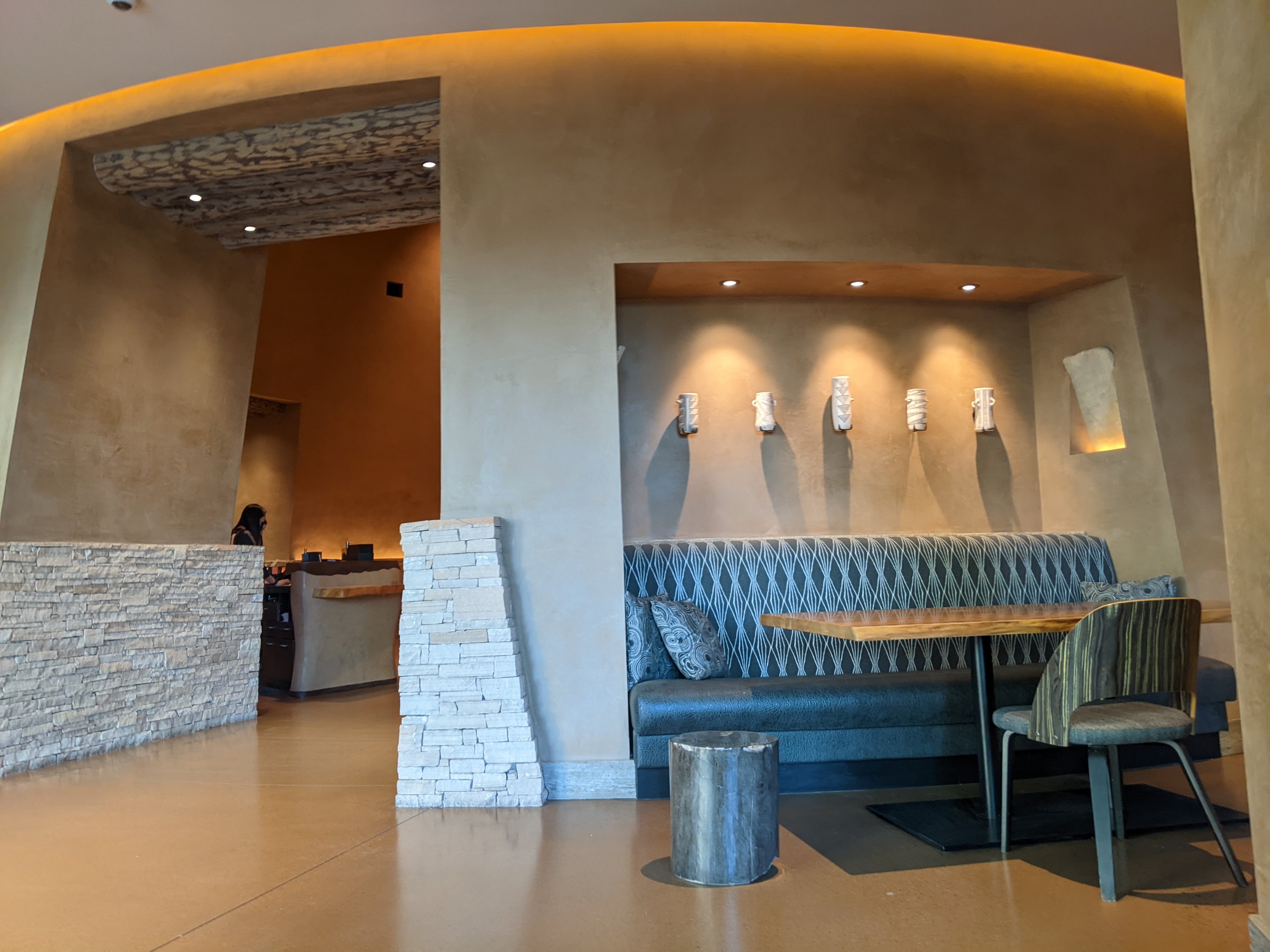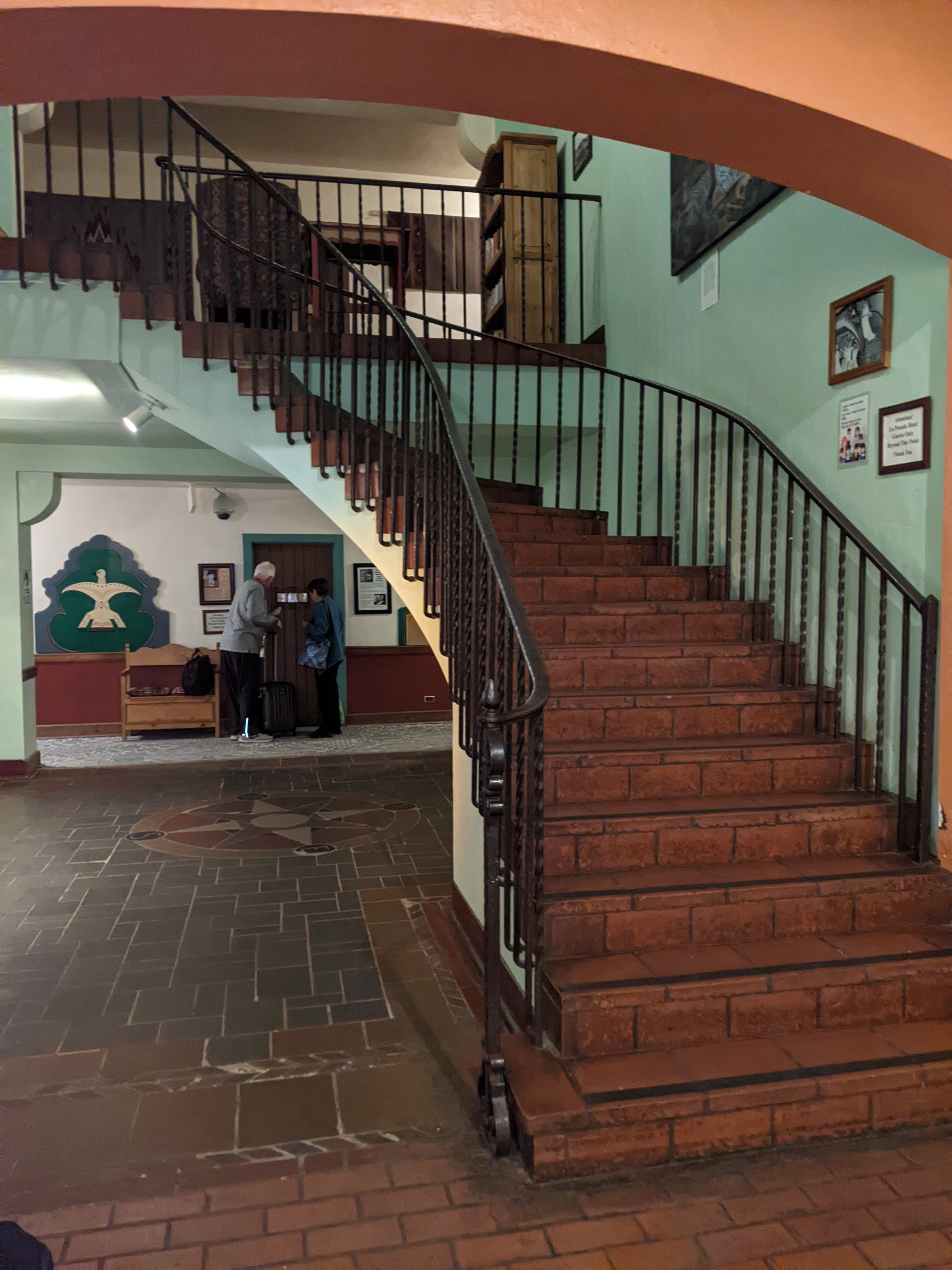 The train stops right at la Posada.Every bit of this hotel is filled with wonderful art, plants, and detailsGuests with mobility issues should request a ground floor room. There is no working elevator in this historic building.One example of the beautiful woodwork art showcased throughout the hotel.A beautiful headboard in one of the roomsThere are lovely seating areas throughout the hotel.