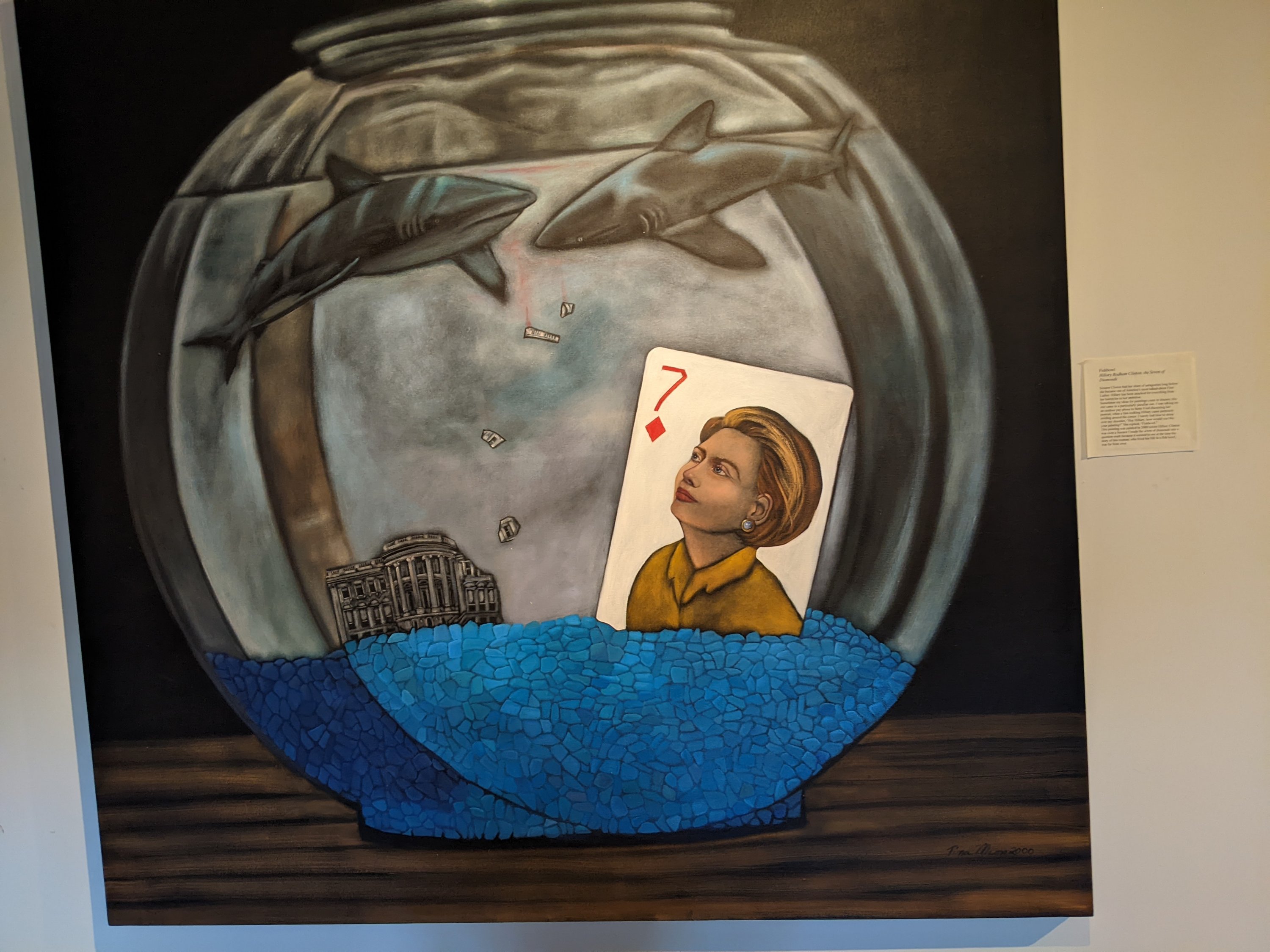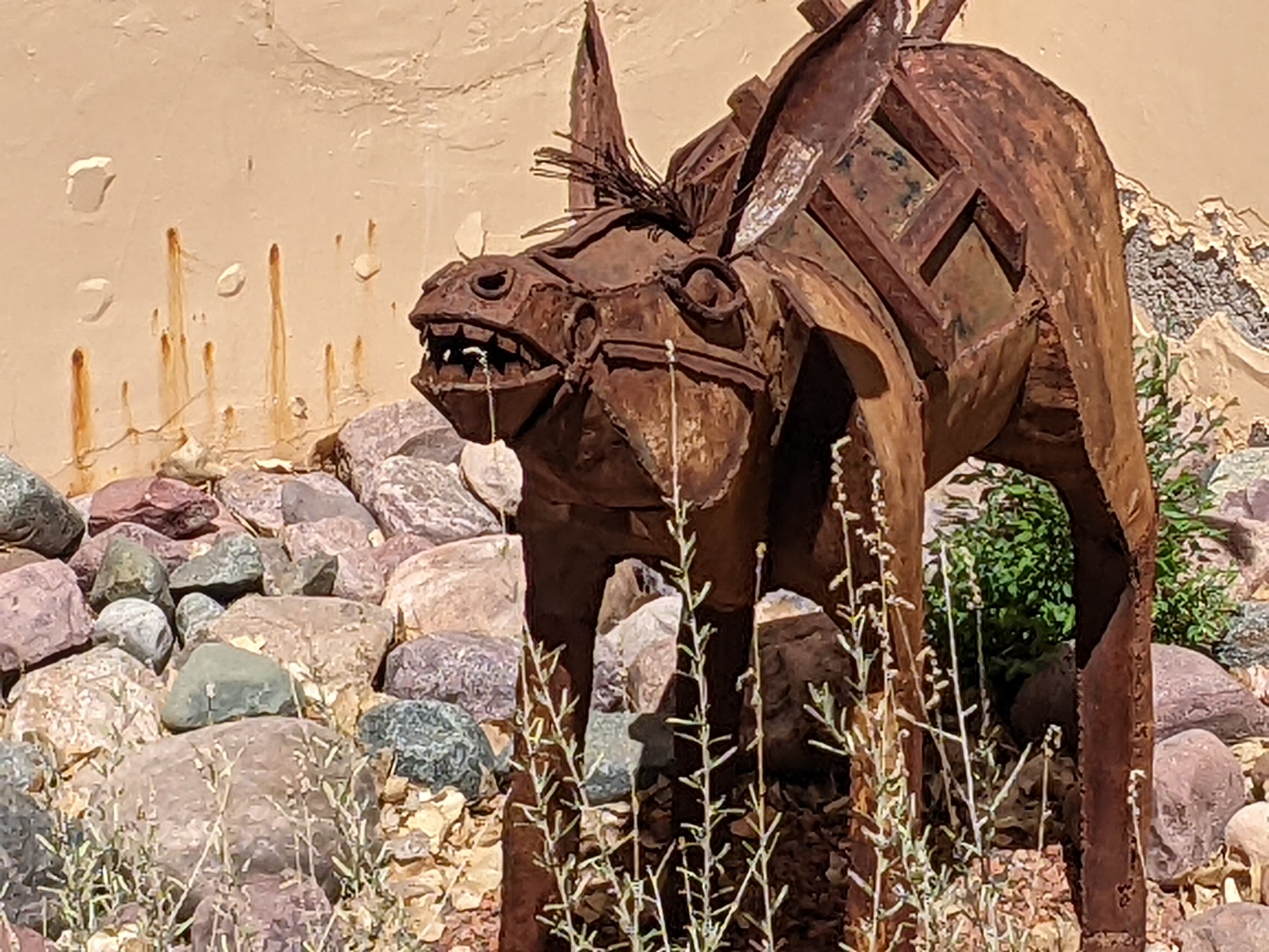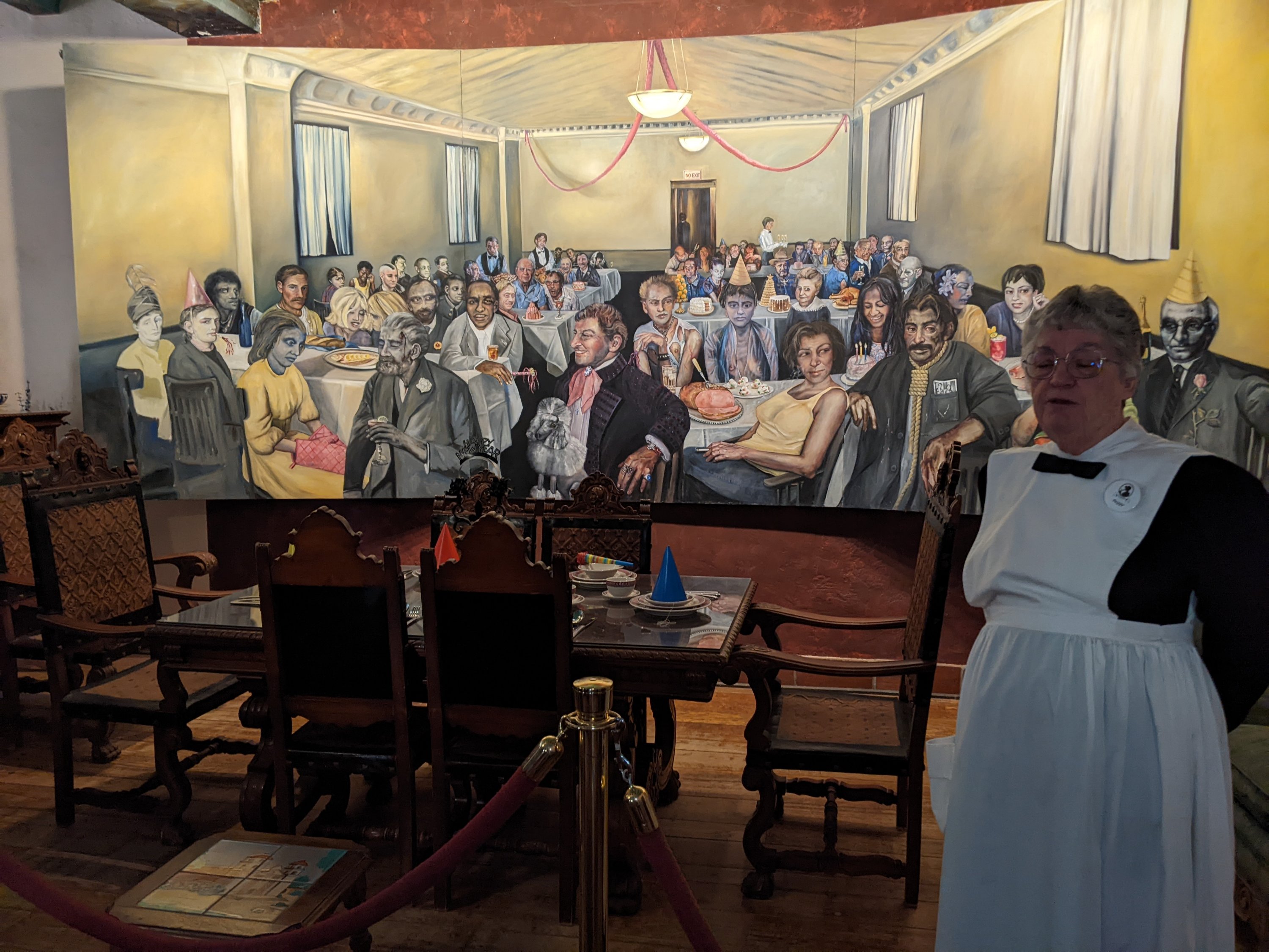 One of many garden seating areasSigns make it clear that the hotel is the official boarding site for AmtrakThe sign for the hotelAnother view of la PosadaBurro art in the gardensMore garden seatingPeggy from the Winslow Harvey girls gave an amazing presentation about la Posada and the Harvey girls. She’s an extraordinary storyteller and is available for group tours at just $5/person. Call Peggy Nelson at 928-289-4160 or 928-587-2287 to arrange a group tour. It’s well worth it.Peggy took us on a tour of the paintings, including this suicide painting by hotel co-owner Tina Mion. Her paintings are exquisitely done but not necessarily themes you’d want for your house.Another Tina Mion paintingTina’s description of the paintingThe turquoise dining room. The panels to the right are stained glass Santos.A wickedly good dessert souffleHalf of a vegetarian platter (we split it, and it was plenty)A chicken dish