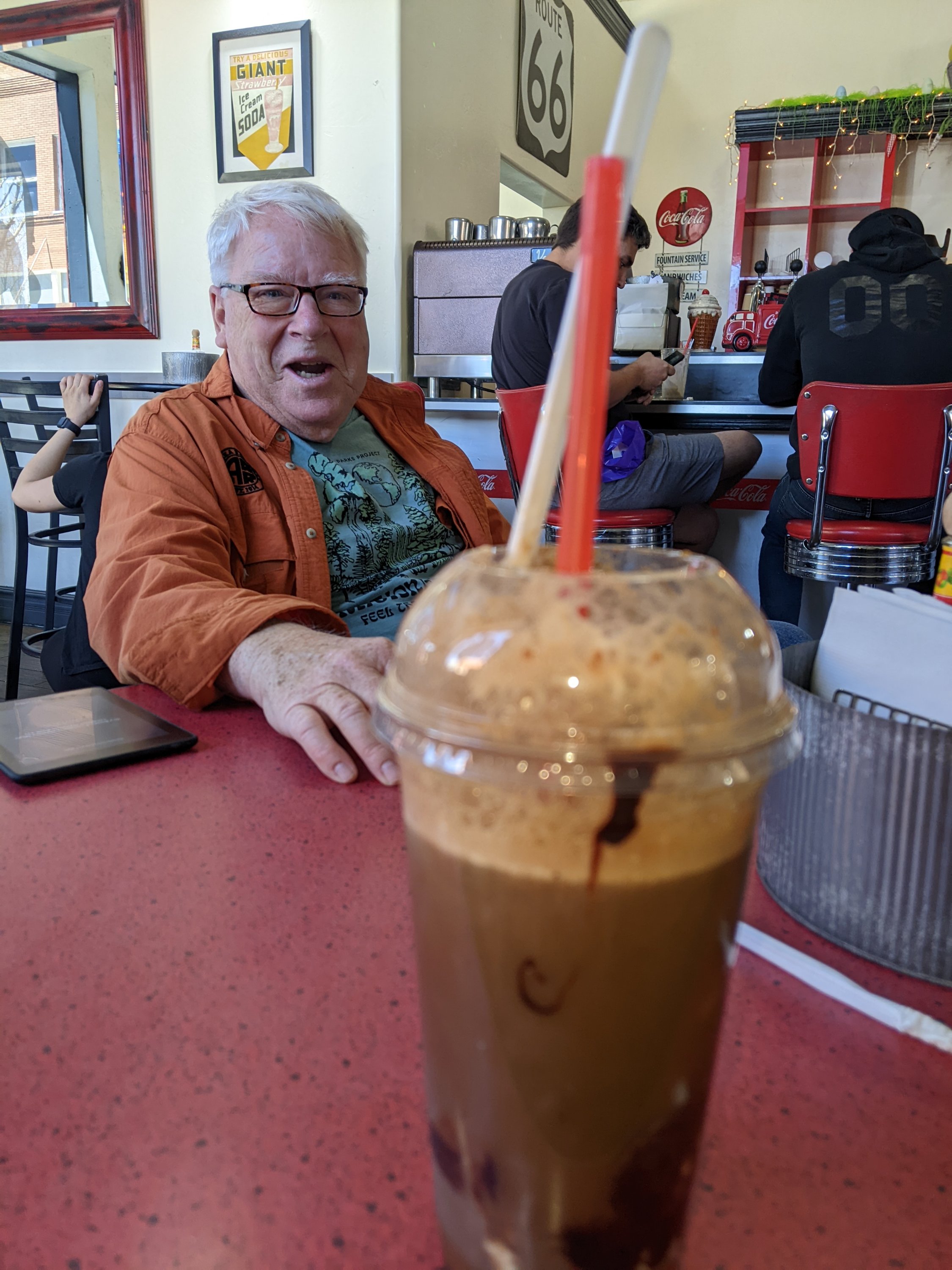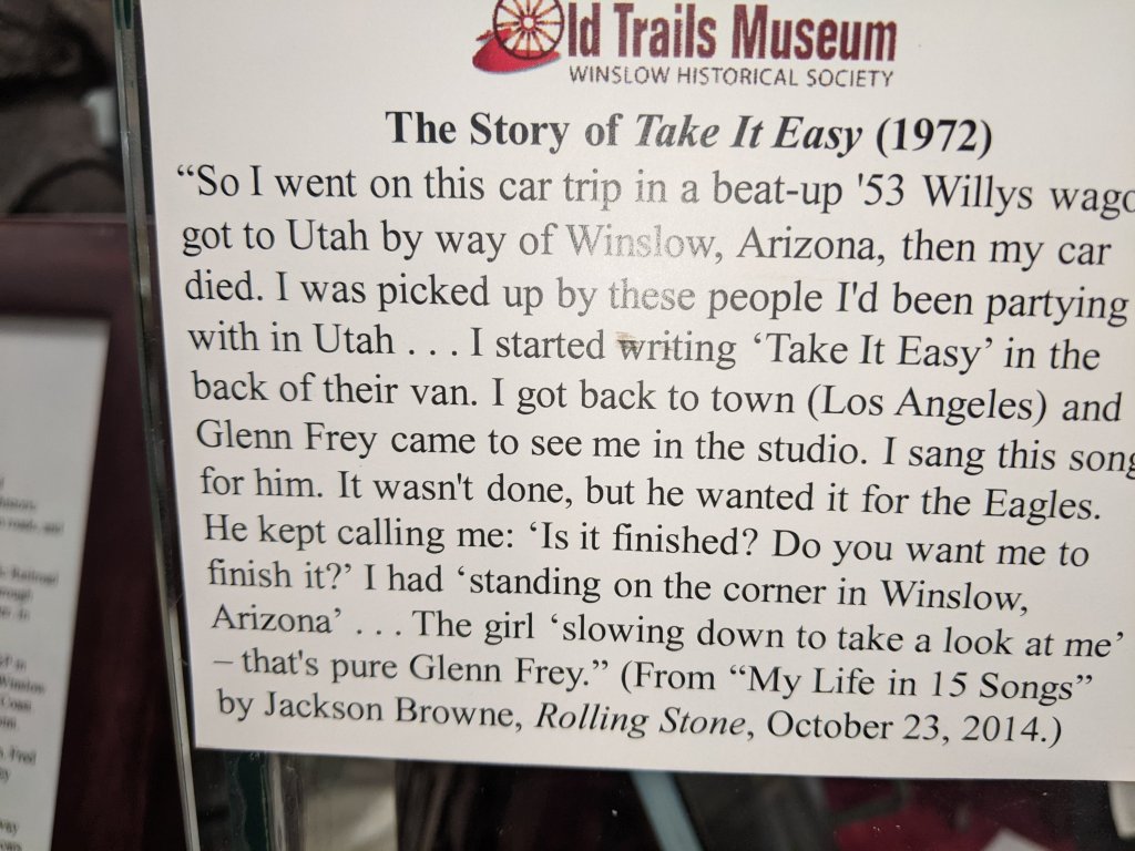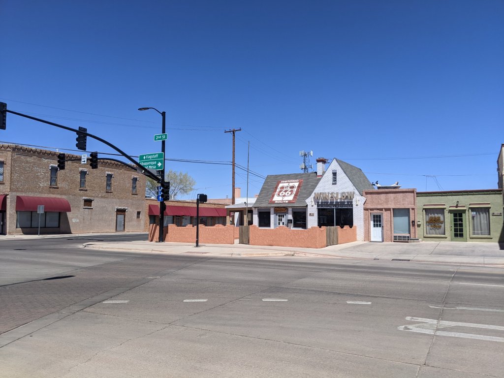Winslow is known for the song Take it Easy by the Eagles. It includes the line “standing on the corner in Winslow, AZ”.Ray and I stopped at a soda and sandwich stop in Winslow. This is a black cow, a root beer float with chocolate syrup. Prices were very reasonable.Street scene from Winslow. Winslow is on old route 66, one of the most famous roadways in AmericaThe local market