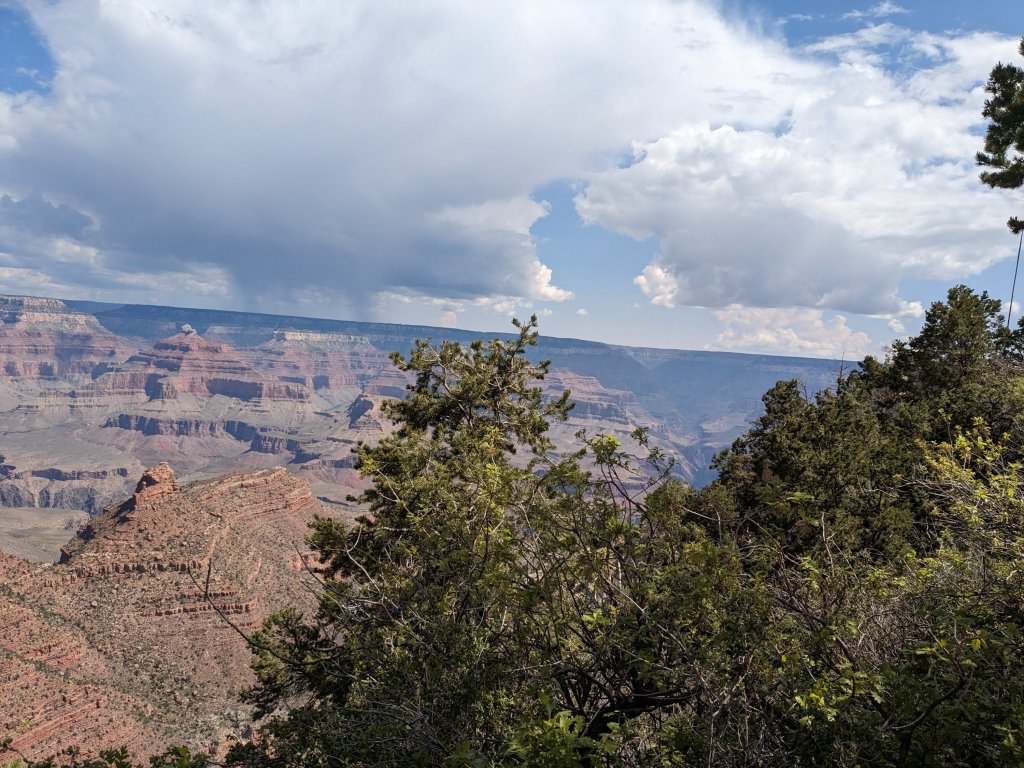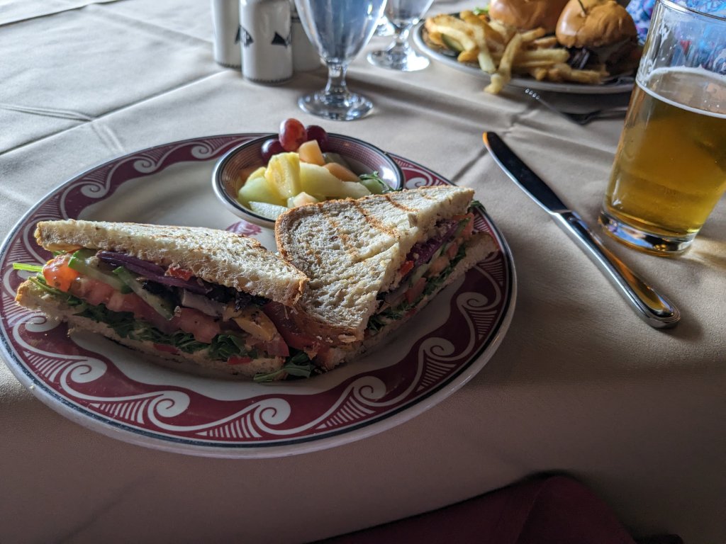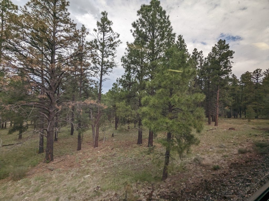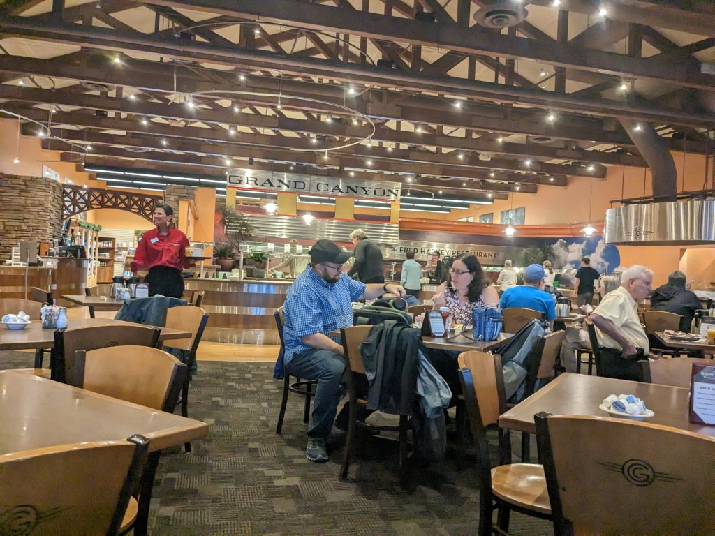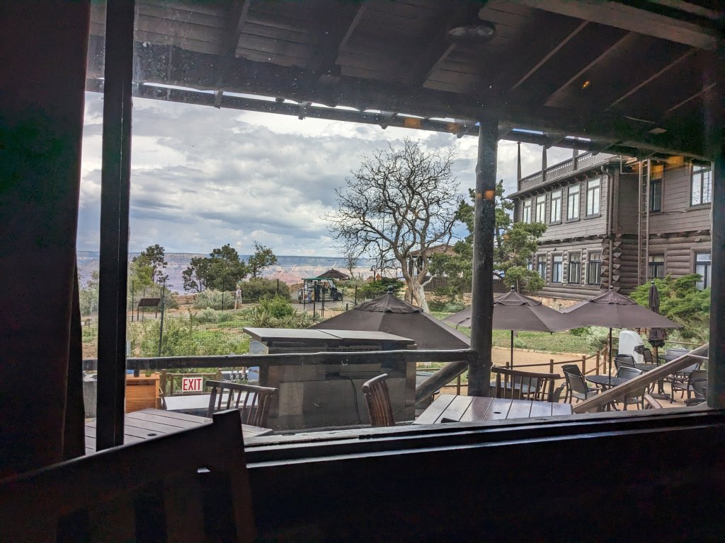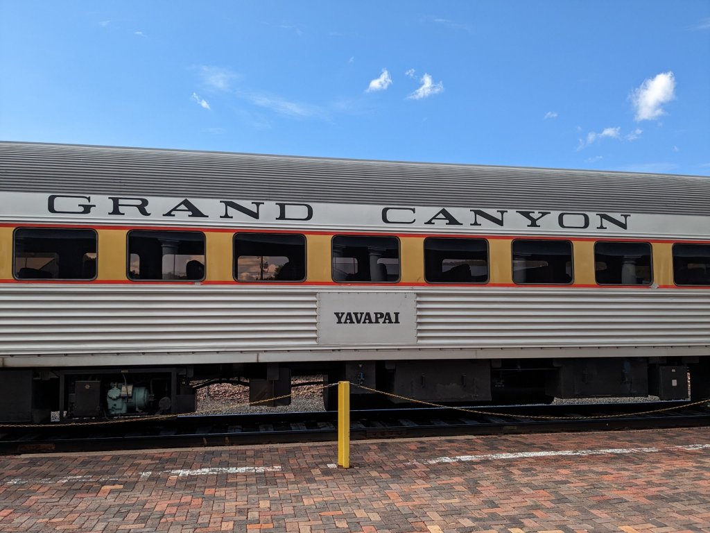 The trip was a fundraiser for Wheels Museum so we met there before hopping on our Amtrak train We’re all settled in on the Amtrak train to Flagstaff. From Flagstaff, we took a shuttle to Williams and the Grand Canyon Railroad hotel. This is the lobby.The rooms were spacious and comfortable and they had a lovely pool We had breakfast at the Fred Harvey restaurant before walking over to the train station across the street.The Grand Canyon rail goes from Williams to the Grand Canyon. On our way, we saw antelopes, javalinas, an elk, a coyote, cows, ranch horses and wild horses.Scenery along the train route.The Grand Canyon is spectacular.Another view of the canyon.We found cephalopods and other fossils in the original grand canyon soil.Another beautiful view of the canyon.A great vegetarian sandwich at El Tovar.The view from our lunch table at El Tovar. To have a chance to snag one of the rare window seats, make the earliest lunch reservation and cross your fingers.My friend’s sandwich Apple caramel creme brulee. Yummy.