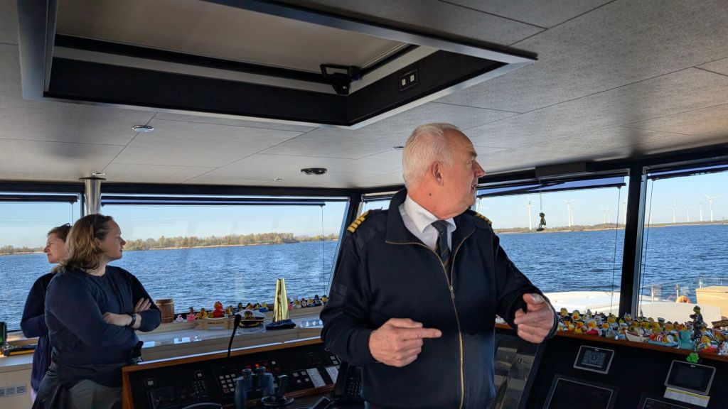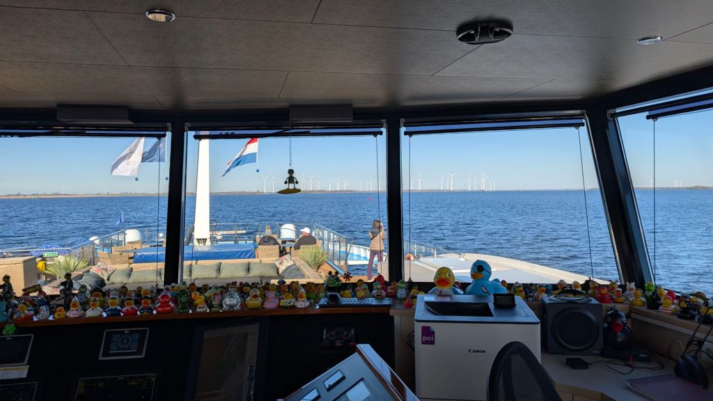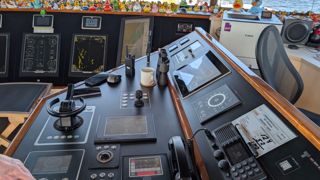 We had a fun tour of the wheelhouse with captain Rolf. In the background is a huge collection of rubber ducks and frogs collected by Captain Rolf and the other ship’s captain.